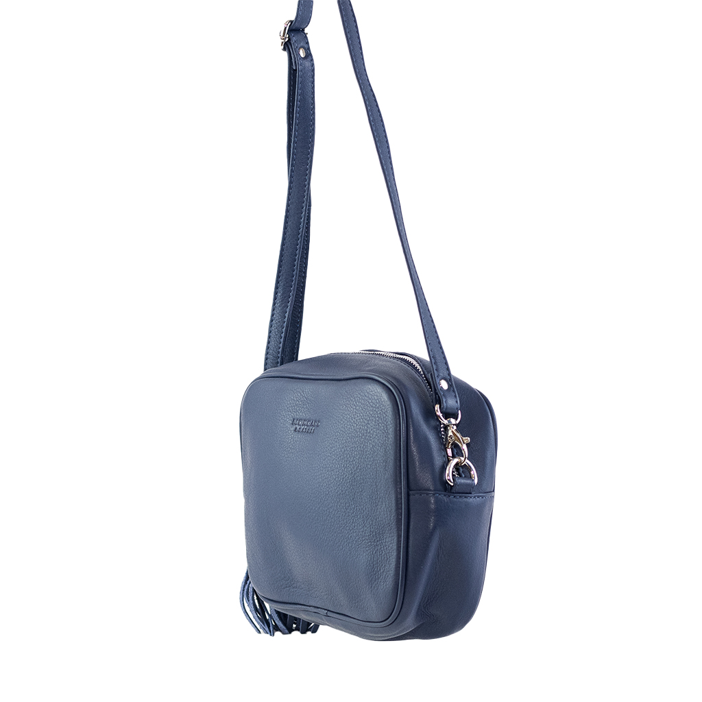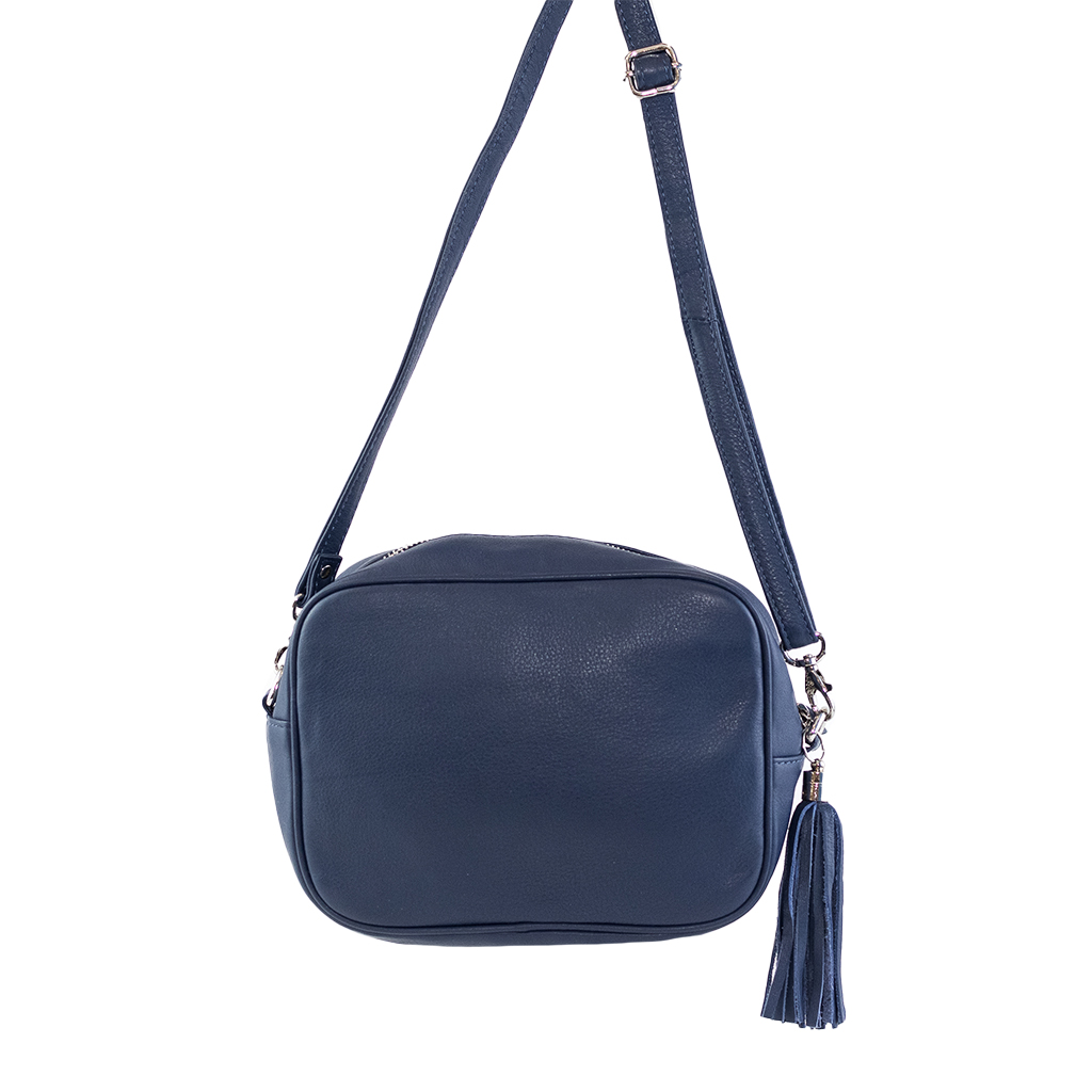 Bolso con asa bandolera. Borlón de piel en el cursor.