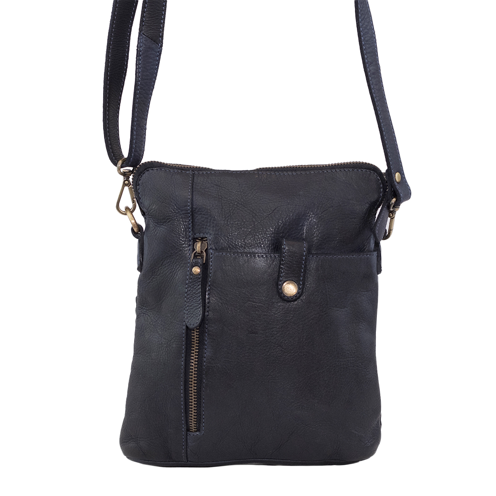 Asa bandolera regulable con mosquetones. Cremallera delantera. Bolsillo trasero con broche. Cremallera trasera. Medidas: 25cm alto x 21cm ancho x 4 cm fondo.