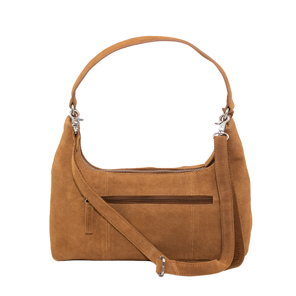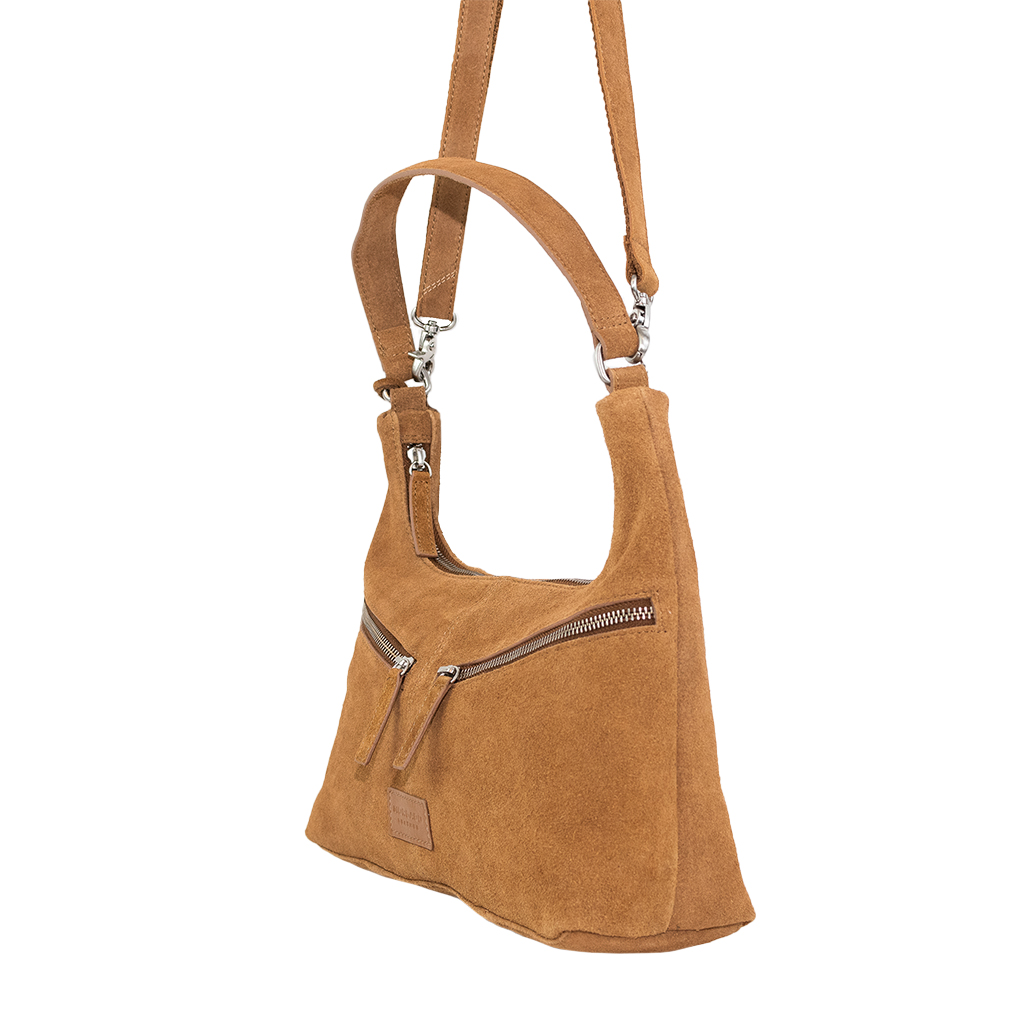 Bolso serraje con asa corta y bandolera regulable. Dos bolsillos delanteros con cremallera. Cremallera trasera.