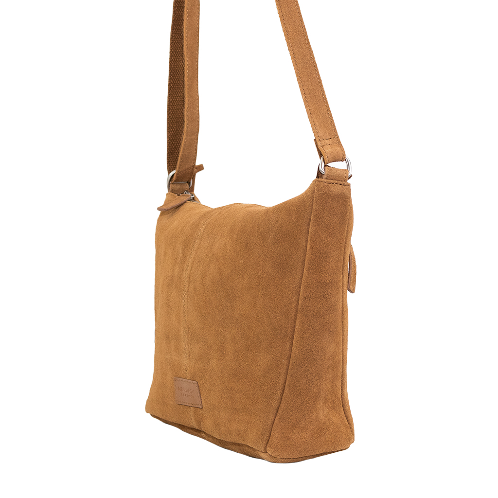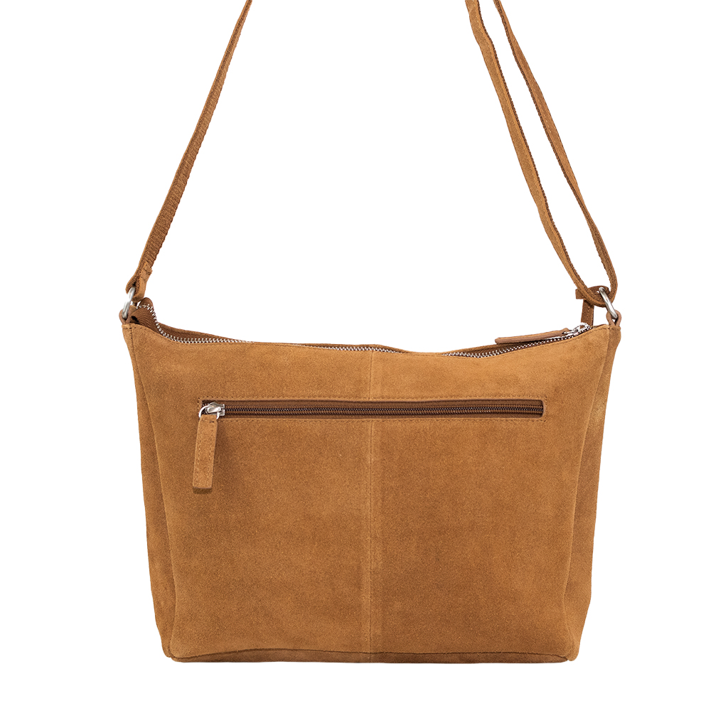 Bolso serraje con asa bandolera regulable. Cremallera trasera.