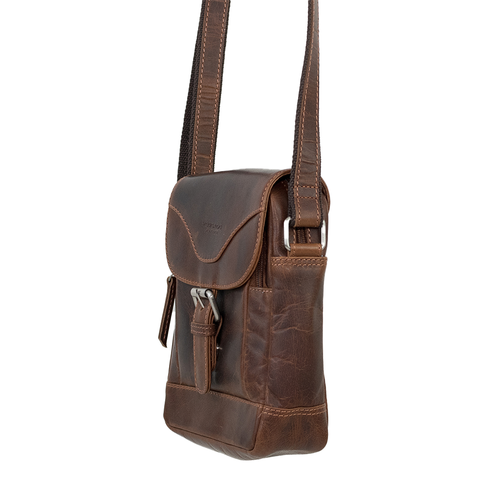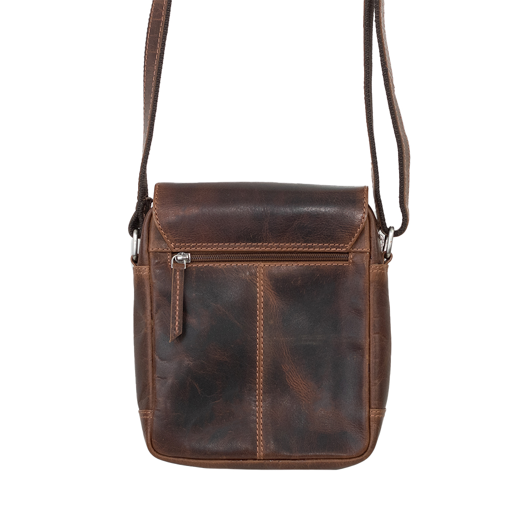 Bolso unisex con asa bandolera regulable. Tapeta delantera con hebilla e imán. Cremallera trasera.
