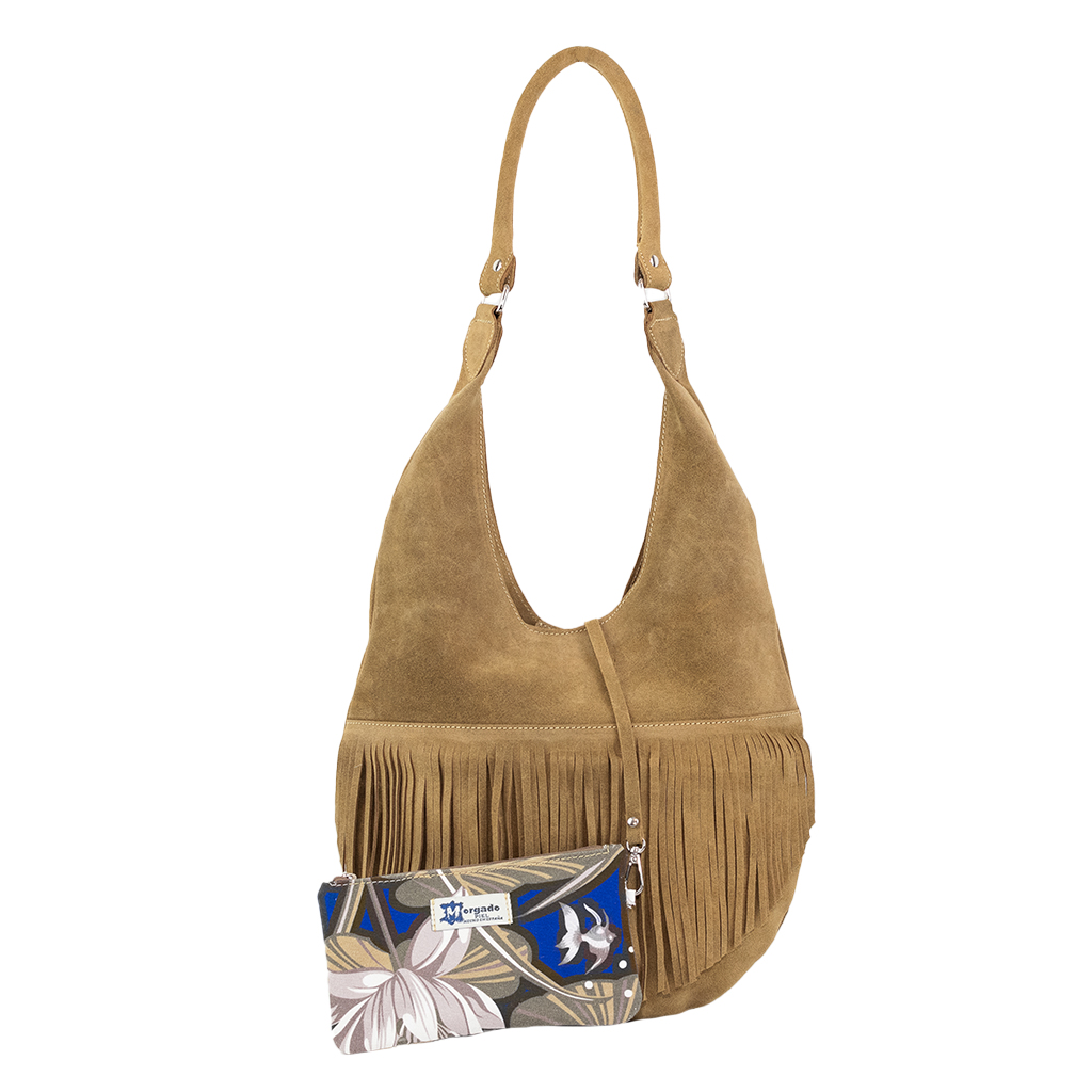 Bolso de señora al corte. Asa corta. Delantero con flecos. Cierre con broche imán. Neceser en su interior.