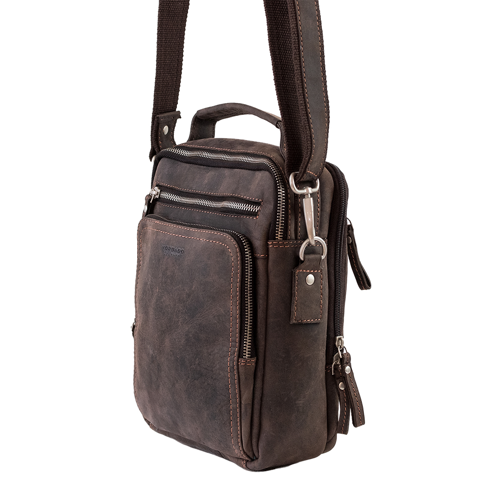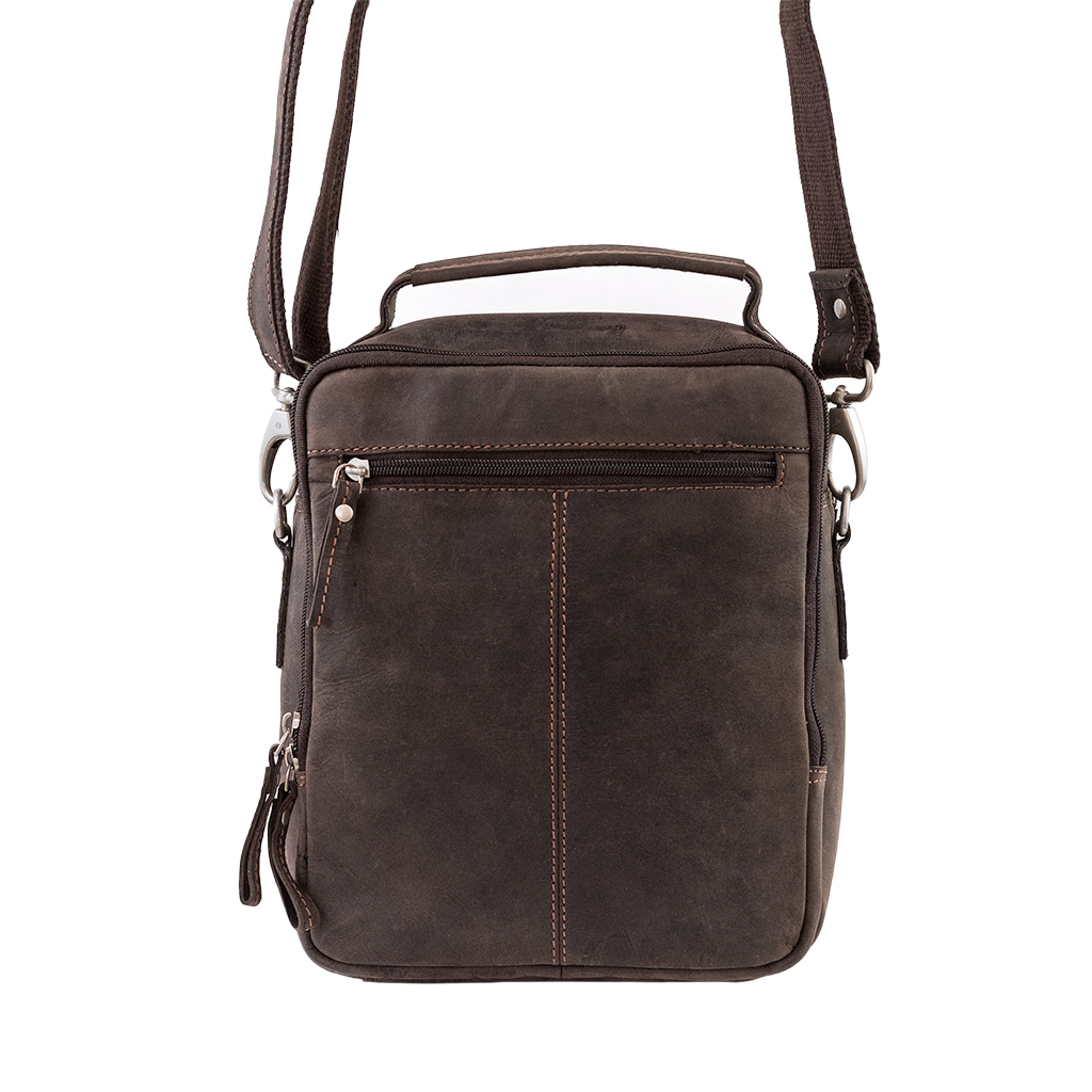 Bolso unisex con asa de mano y bandolera regulable. Dos bolsillos delanteros y cremallera trasera.