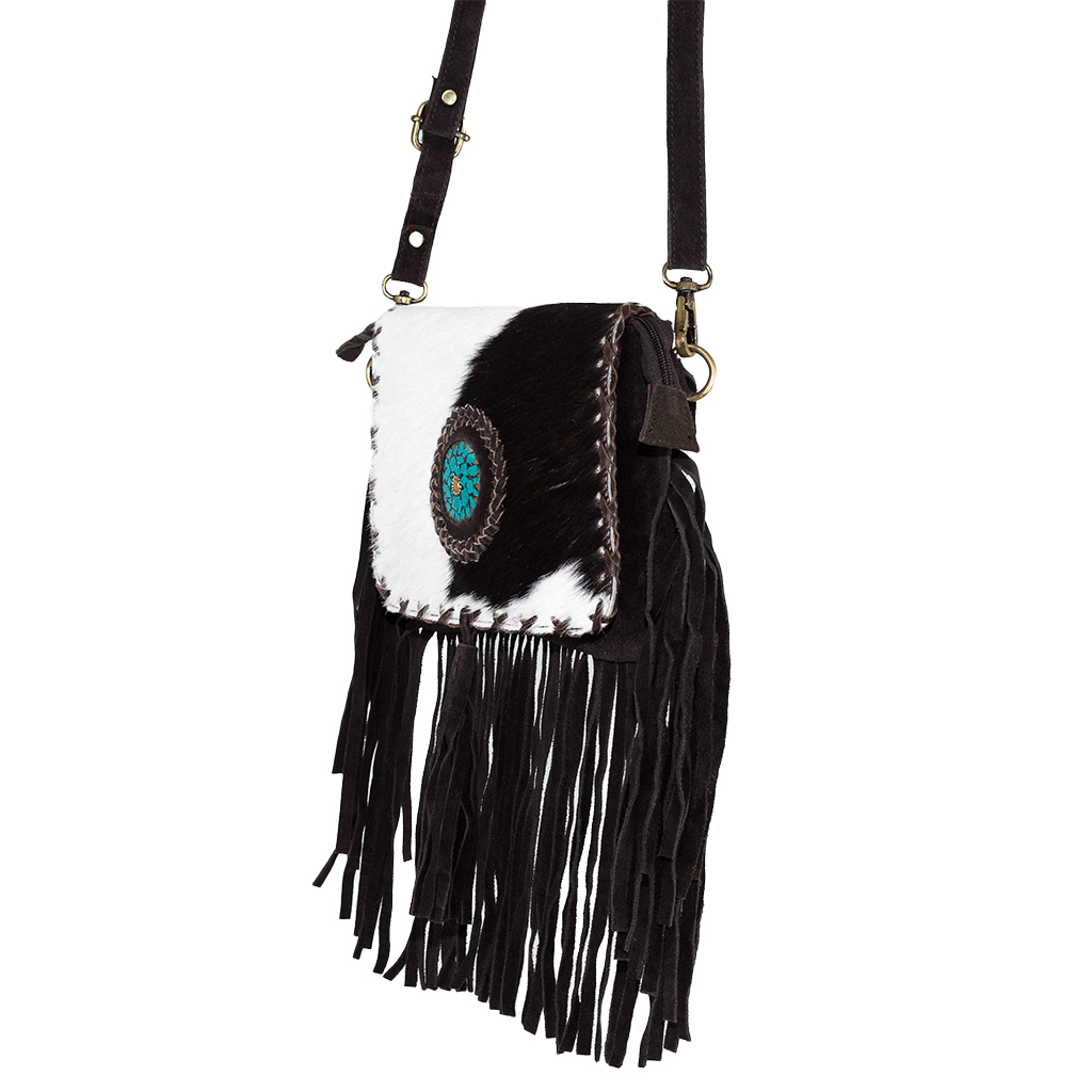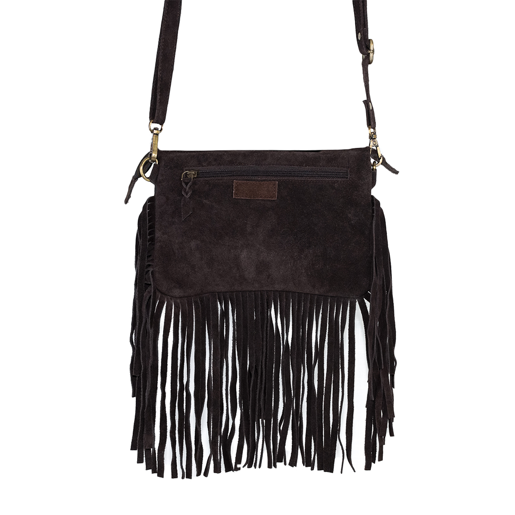 Bolso con asa bandolera regulable. Piel serraje ternera con flecos. Tapeta delantera con pelo natural, trenza de piel y adorno central. Cremallera trasera.