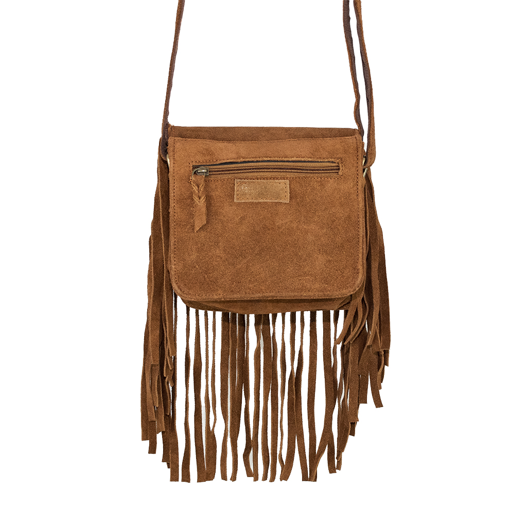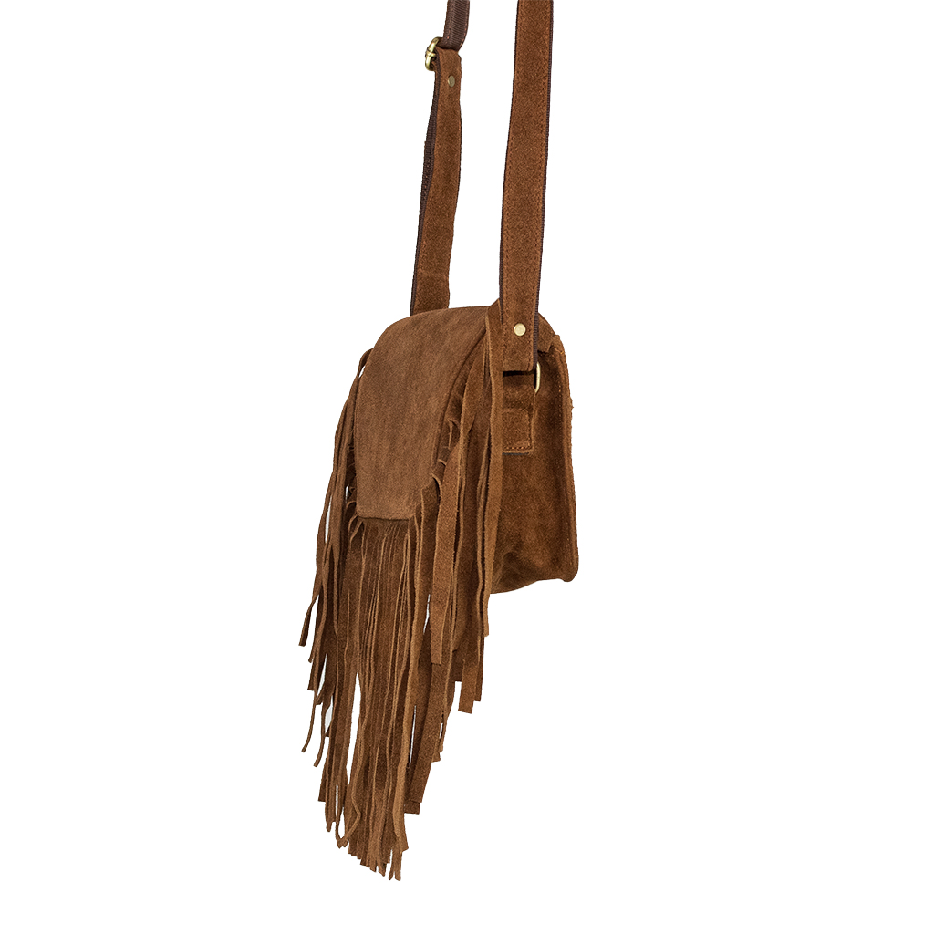 Bolso pequeño con asa bandolera regulable. Piel serraje ternera con flecos. Cierre con cremallera. Cremallera trasera.